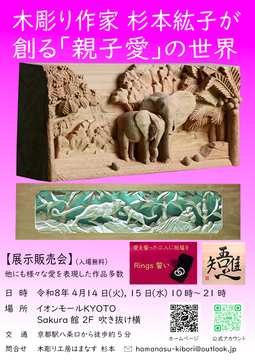期間中は木彫り作家 杉本紘子が常駐しますので、お気軽にお声かけください。